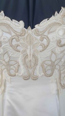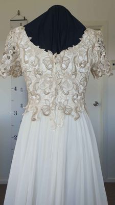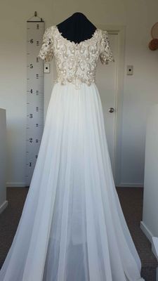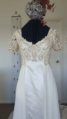 Wedding dress sizes are tricky. Please check your measurements against the mannequin measurements listed above to see if this dress could be a good fit. If you would like me to set up the mannequin with your measurements to check if it fits please get in contact.