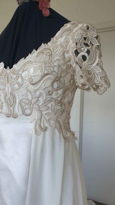 Unique style and vintage glamour. A Vinka Design sheath dress that has regency vibes with the flowing chiffon overlayer and beautiful gold lace bodice.