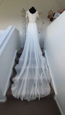 In good vintage condition, some areas of discolouration but nothing overly noticeable. The train is the real showstopper of this dress.