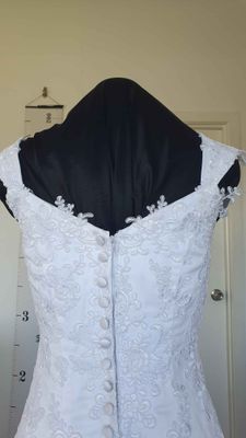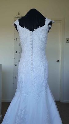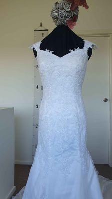 Wedding dress sizes are tricky. Please check your measurements against the mannequin measurements listed above to see if this dress could be a good fit. If you would like me to set up the mannequin with your measurements to check if it fits please get in contact.