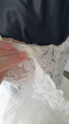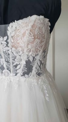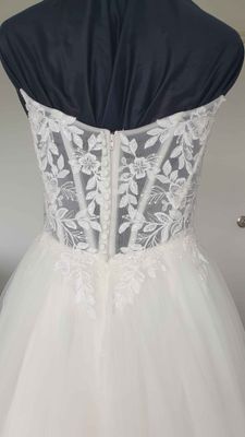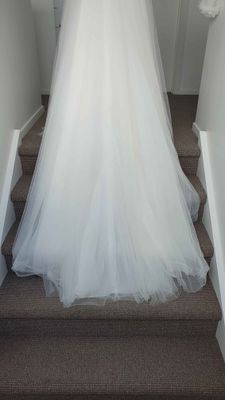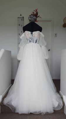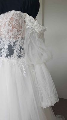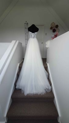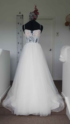 In excellent pre-loved condition. Was drycleaned after use, we spotted one area on the skirt with some marks (last picture) but it gets hidden within the ample tulle fabric. Comes with dress bag.