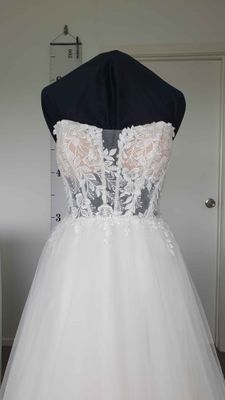 Wedding dress sizes are tricky. Please check your measurements against the mannequin measurements listed above to see if this dress could be a good fit. If you would like me to set up the mannequin with your measurements to check if it fits please get in contact.