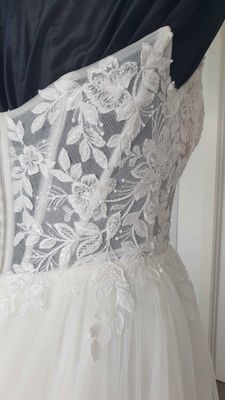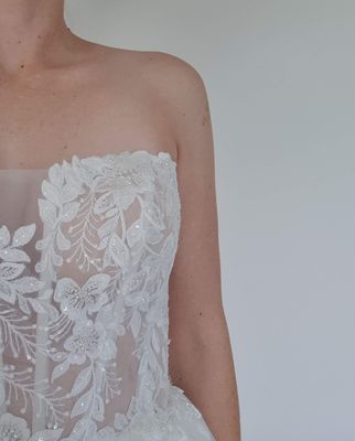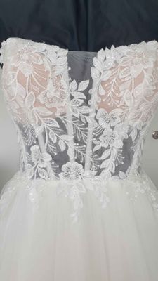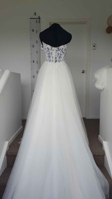 A full multi layered tulle skirt ties in beautifully with the detailed bodice, giving the dress a classic style. Features a mid length, lightweight train