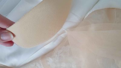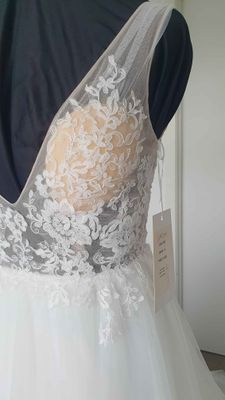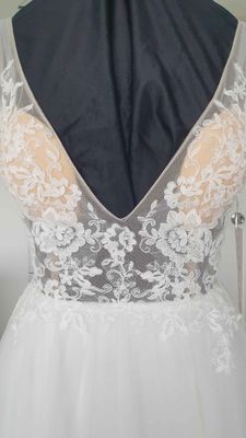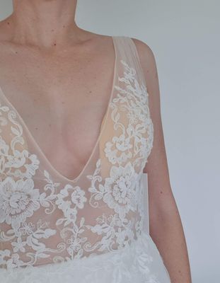 Very deep V opaque style bodice, with wide set straps. Perfect for a fun, flirty bride looking for a more sexy bridal style. Lace is scattered all over the tulle bodice, and there are beige coloured cups inside. The cups are currently only loosely attached so could be removed to add lining, or just add a couple of extra stitches once you know placement for more secure coverage.