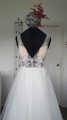Wedding dress sizes are tricky. Please check your measurements against the mannequin measurements listed above to see if this dress could be a good fit. If you would like me to set up the mannequin with your measurements to check if it fits please get in contact.