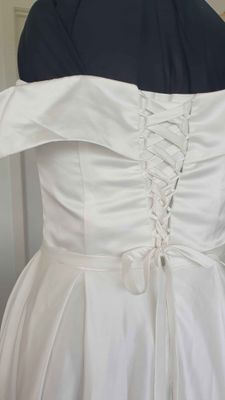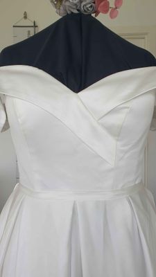 Off the shoulder with a crossover collar reminiscent of the Forget Me Knot Isabel Gown.