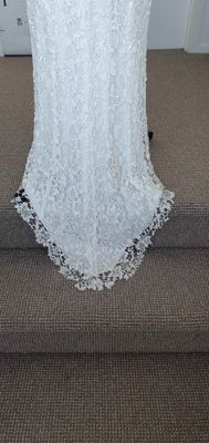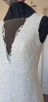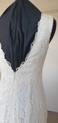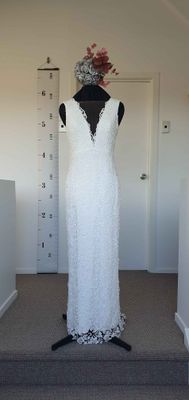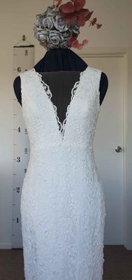 This gorgeous dress is perfect for a bride looking for a simple dress shape, but loves lace. Features an embroidered floral lace covering a crepe underlayer, which is fully lined with a lovely soft satin.