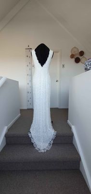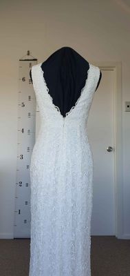 Wedding dress sizes are tricky. Please check your measurements against the mannequin measurements listed above to see if this dress could be a good fit. If you would like me to set up the mannequin with your measurements to check if it fits please get in contact.