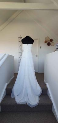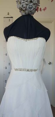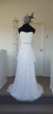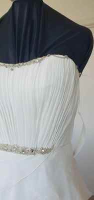 Beading along the top of the strapless bodice, and at the waist, give a touch of bling. Lightweight and easy to wear, the skirt has a mid length train.