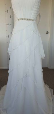 New, with tags still attached, this gown from the Hera Couture Edelweiss collection features beautifully layered chiffon to create a unique skirt design for the bride to be looking for something just a little bit different.