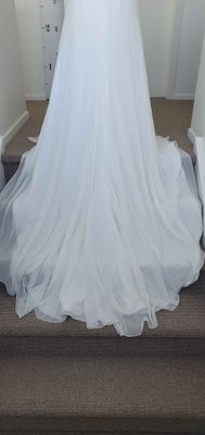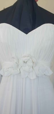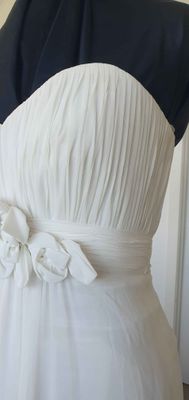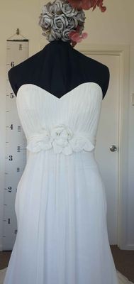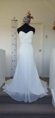 A gorgeous wedding gown that is shaped to flatter the body. Drapes beautifully from the empire/waist line, which features some handmade chiffon flowers.