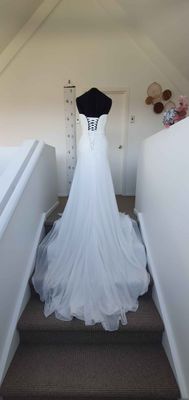 Wedding dress sizes are tricky. Please check your measurements against the mannequin measurements listed above to see if this dress could be a good fit. If you would like me to set up the mannequin with your measurements to check if it fits please get in contact.