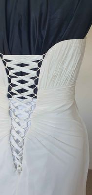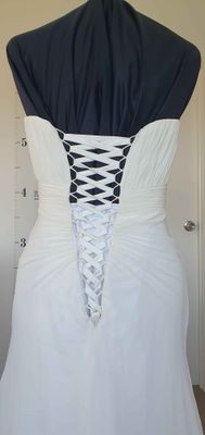 The strapless sweetheart style bodice is covered with a ruched chiffon to give a bit of texture. The corset style back offers some size flexibility. The bodice is boned and has some padding at the bust.