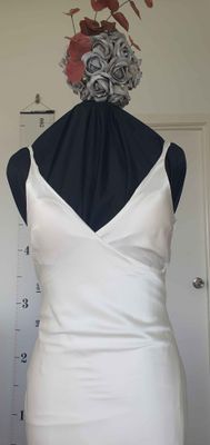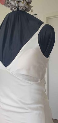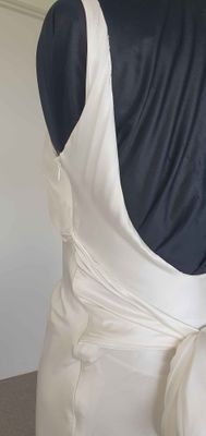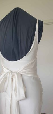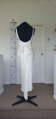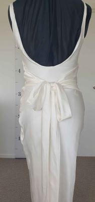 V neck cross over design bodice with a low back. Long ties attached to the side to be pulled back tied into a bow, or could be knotted and left to trail behind like a train. Ideal for a more casual wedding or elopement, or as a lightweight reception dress.