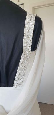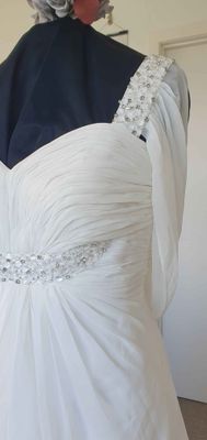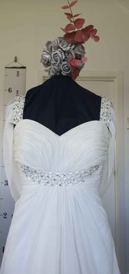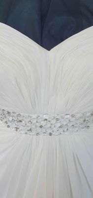 Extra chiffon falls from the empire line to create a lovely effect at front of the skirt which should move beautifully while you walk down the aisle. There is no train on this dress which means it is perfect to party the night away in. Could be an excellent reception dress option.